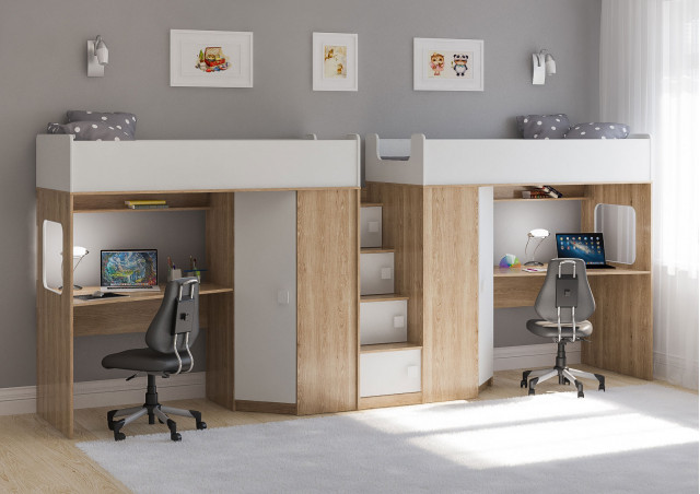 Две кровати, два шкафа, две игровых зоны – одна лестница. Идеальный вариант для двоих детей!