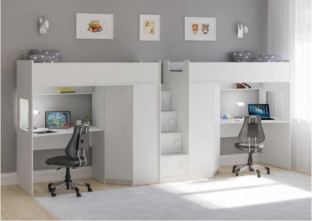Под спальным местом для каждого ребенка располагается рабочее место с встроенным столом.